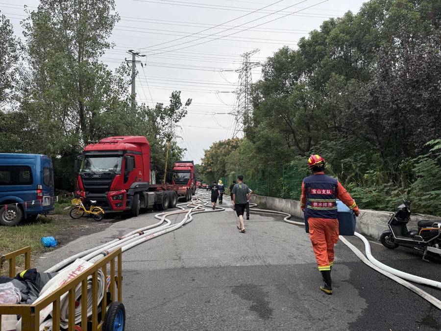 上午7时40分,记者在现场看到,泰和路近江杨北路的路段上停着大量消防车,现场铺设了百余米的消防水带,消防车正不断向现场供水。