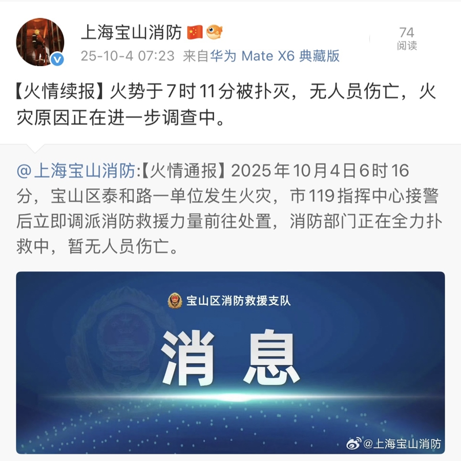 据宝山区消防救援支队发布的火情通报:2025年10月4日6时16分,宝山区泰和路一单位发生火灾,市119指挥中心接警后立即调派消防救援力量前往处置。火势于7时11分被扑灭,无人员伤亡,火灾原因正在进一步调查中。